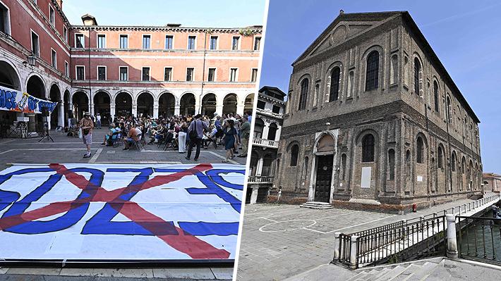 A la izquierda, un grupo de habitantes de Venecia reunidos para protestar por el matrimonio de Jeff Bezos y Lauren Sánchez. A la derecha, la Escuela de la Misericordia, donde se realizaría la ceremonia principal.