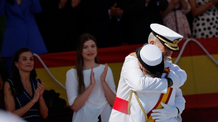 Tras las miradas de complicidad y las sonrisas que ambos se dedicaron mientras el rey colocaba la banda con la bandera española, Felipe VI y la princesa Leonor se fundieron en un abrazo, separándose después con el tradicional saludo militar.