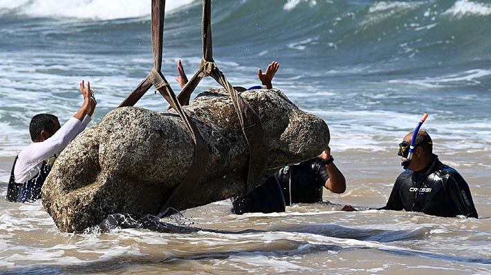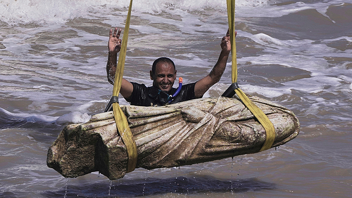 El jueves grúas levantaron lentamente varias estatuas a la superficie. "