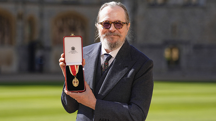 Gary Oldman con su medalla tras ser investido Caballero del Imperio Británico.