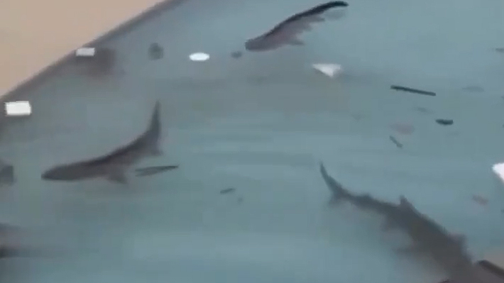 Precisamente, los videos con tiburones nadando en calles o piscinas inundadas, son
