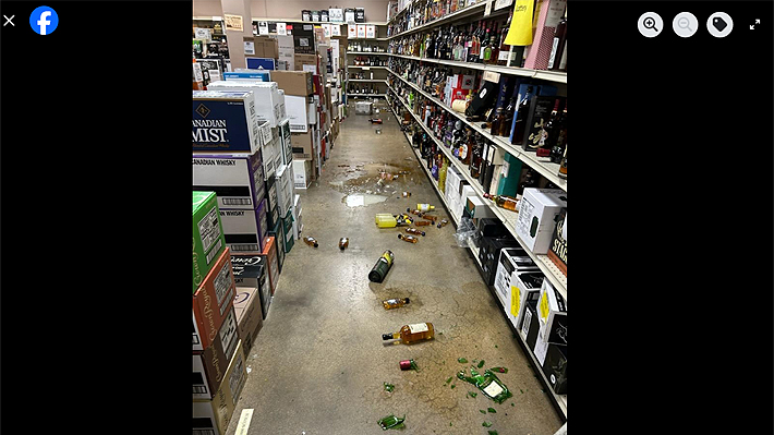 pasillo del establecimiento con más de una decena de botellas de alcohol tiradas en el suelo, algunas rotas, y varios charcos. Otra imagen muestra al