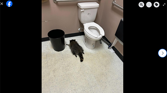 mapache durmiendo en el baño entre el inodoro y el basurero.