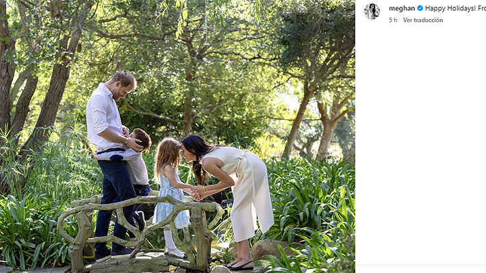 en la que aparecen junto a sus hijos Archie (6) y Lilibet (4) en un puente de madera sobre un pequeño arroyo.