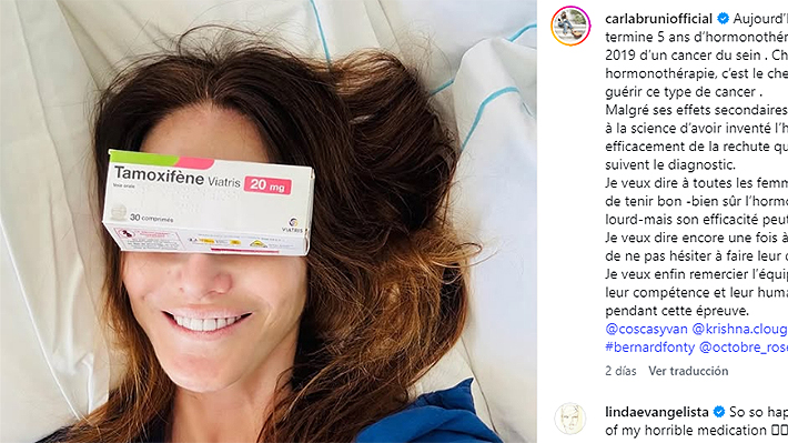 A pesar de sus efectos secundarios bastante agresivos, estoy agradecida a la ciencia por haber inventado la hormonoterapia: protege eficazmente contra las recaídas, que son frecuentes en los años posteriores al diagnóstico", indicó Bruni en un mensaje que acompañó con una foto de ella recostada, sonriente y con una caja de los medicamentos sobre los ojos.