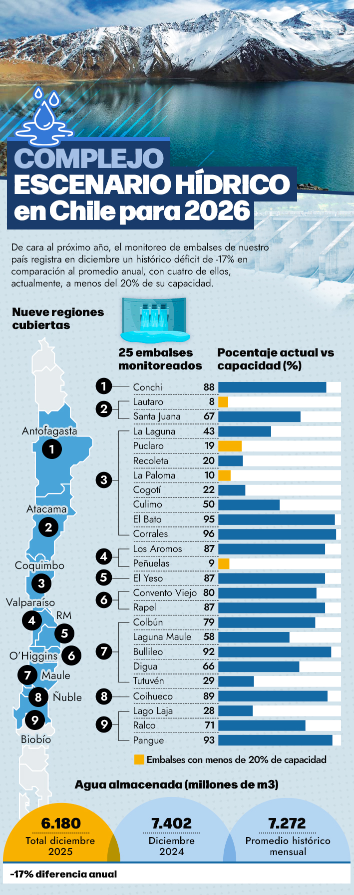 Complejo escenario hídrico en Chile para 2026: Embalses se encuentran en niveles críticos