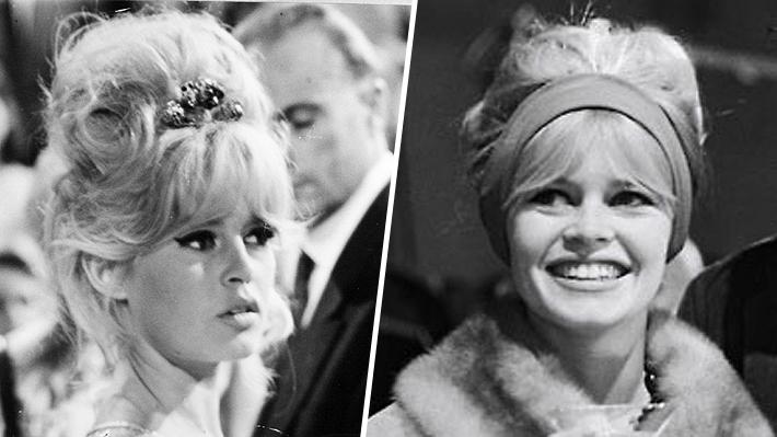 Brigitte Bardot con su característico moño alto (izquierda) y con una cinta ancha para afirmarse el cabello (derecha). Créditos: El Mercurio (archivo).Dos episodios de la visión rompedora de la actriz han sido recordados por la prensa francesa: el