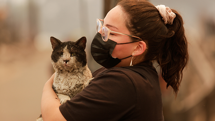 Una mujer rescata a un gato que sufrió quemaduras a raíz de los incendios.