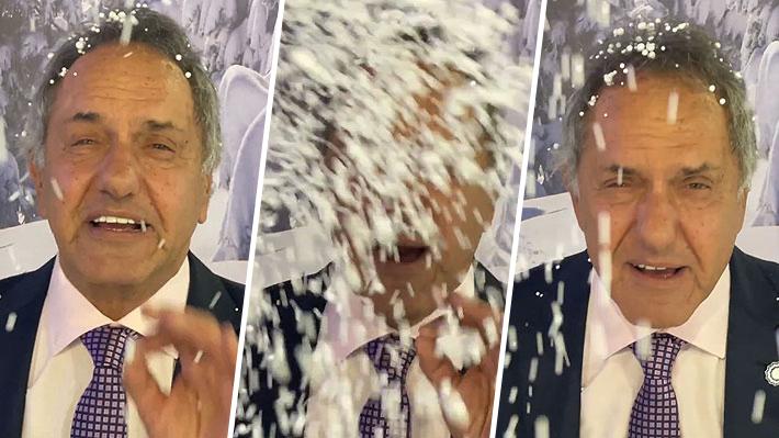 Daniel Scioli recibió la "nieve" directamente en su rostro.