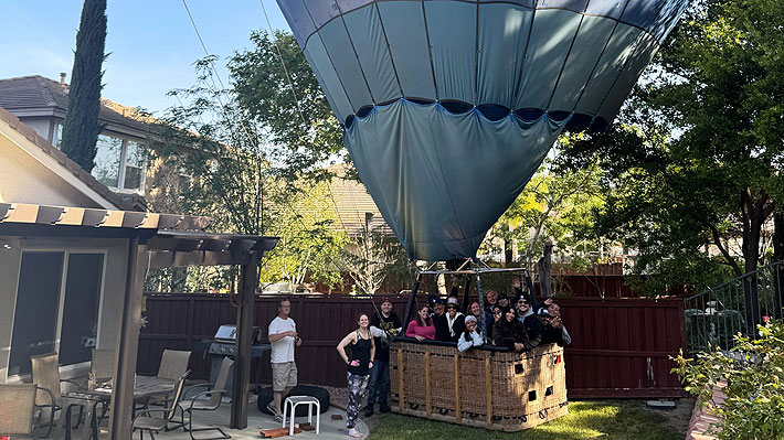 El globo -de color azul con estrellas doradas y la imagen de una luna creciente- causó un espectáculo al descender en el patio trasero, asomándose por encima de la casa de Perrin.