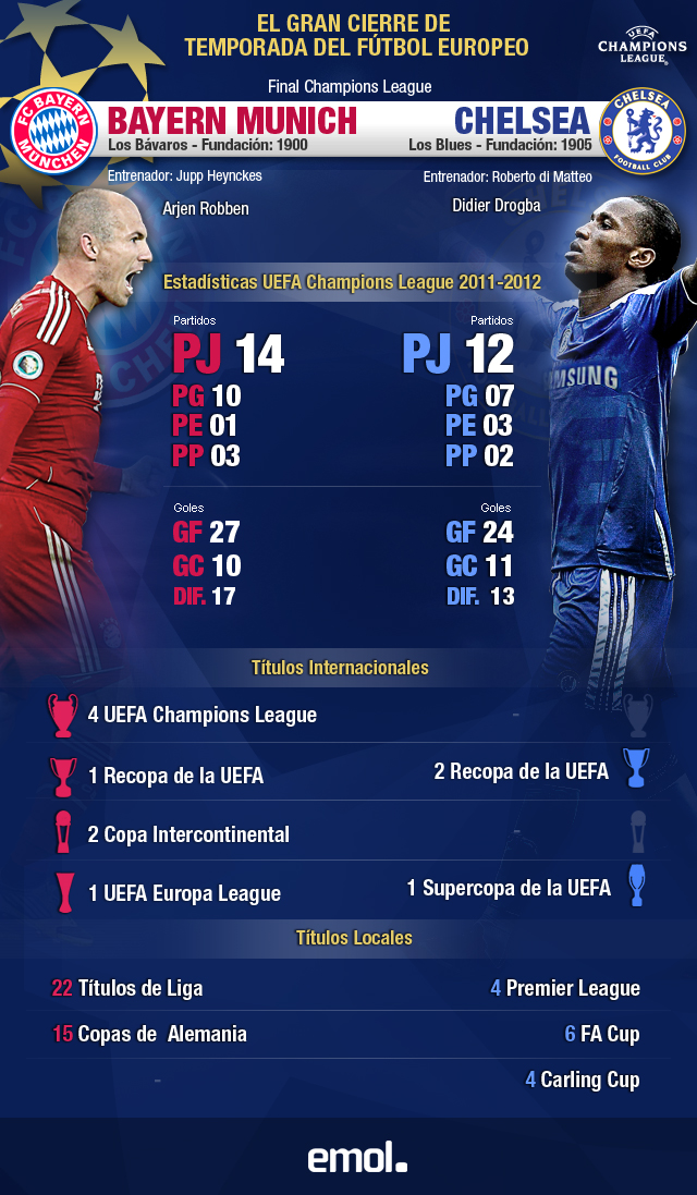 Bayern Munich y el Chelsea juegan este sábado el duelo que definirá al nuevo campeón del principal torneo europeo de clubes. Revise aquí las estadísticas de los aspirantes al título.