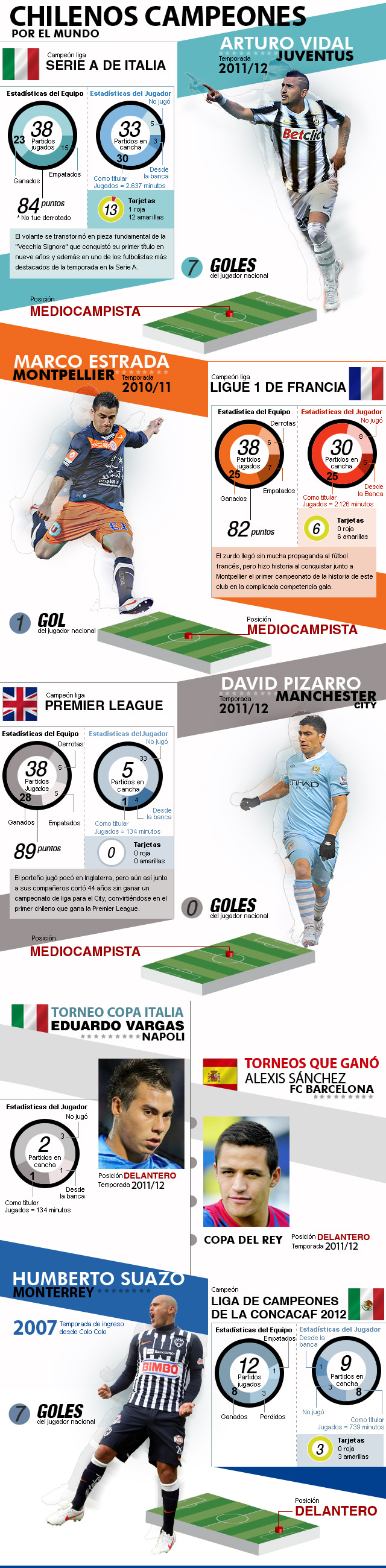 Arturo Vidal, Alexis Sánchez, Marco Estrada, David Pizarro, Eduardo Vargas y Humberto Suazo supieron de éxitos en esta temporada. Aquí sus logros y los números que los acompañan.