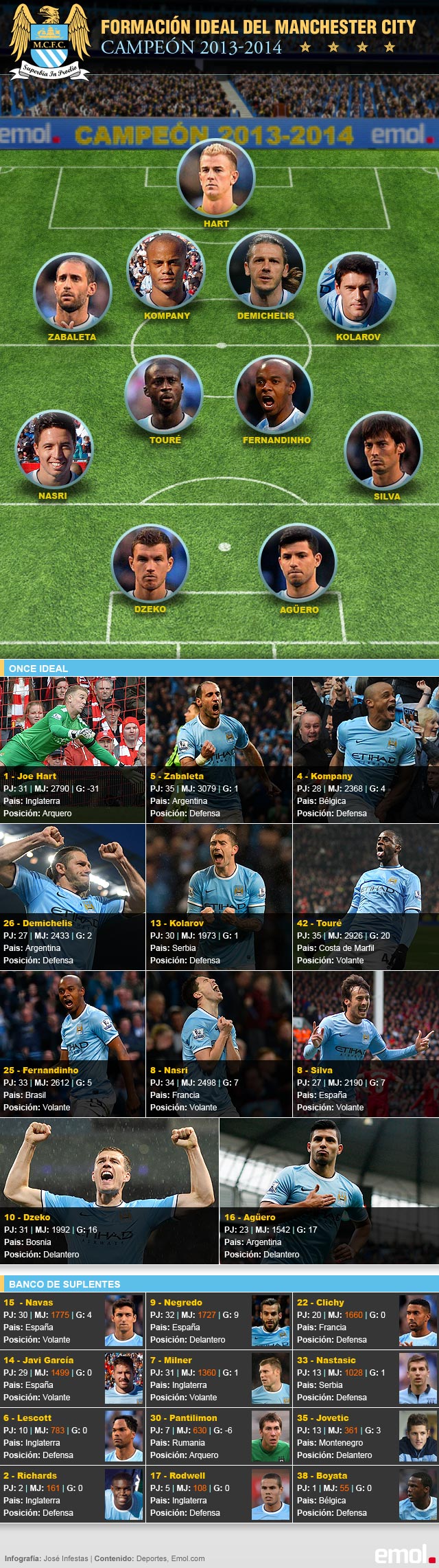 El once ideal del Manchester City de Manuel Pellegrini en la Premier League