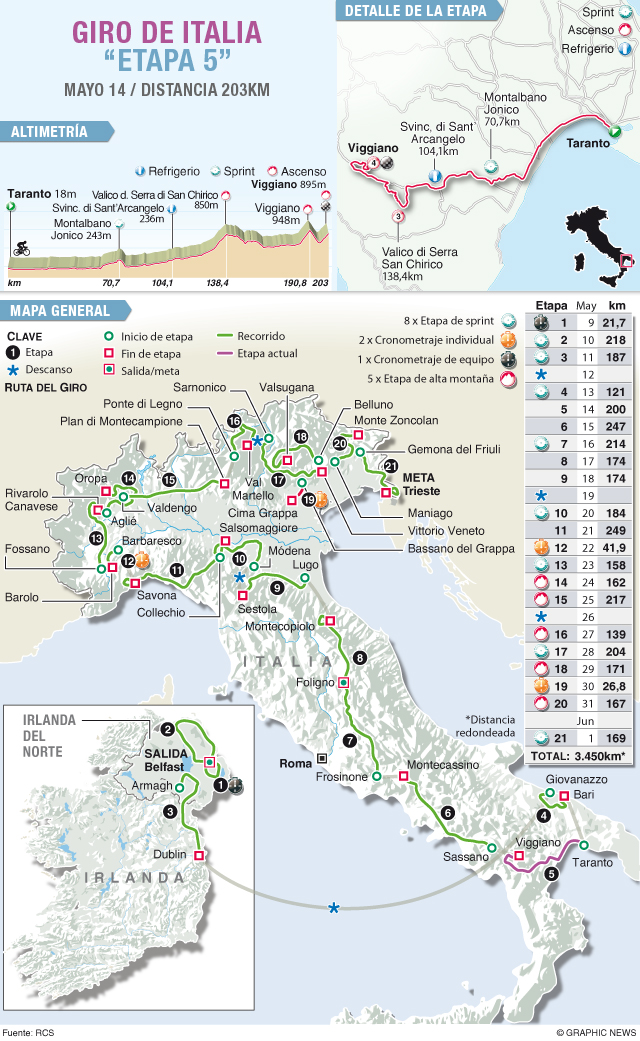 Este miércoles se disputará la quinta etapa, entre Taranto y Viggiano, con 203 kilómetros de recorrrido y donde los últimos 73 tienen algunos obstáculos de montaña, de tercera y cuarta categoría (ver info).