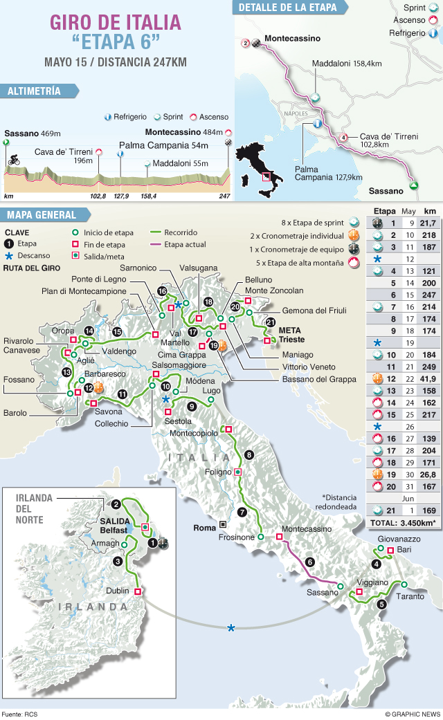 Este jueves se disputará la sexta jornada, con 247 kilómetros de recorrido entre Sassano y Montecassino, y un final de 9 km en ascenso donde los favoritos como Rodríguez, Evans y el colombiano Nairo Quintana (Movistar) tendrán una pequeña oportunidad de estrechar las brechas que los separan del líder.