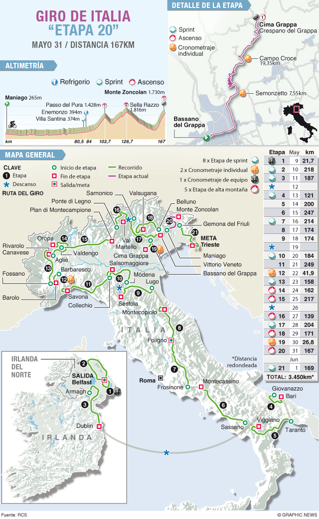 De no suceder algo inesperado, el triunfo de Quintana en el Giro debería confirmarse este sábado cuando se dispute la vigésima y penúltima etapa, entre Maniago y el Monte Zoncolan, de 167 kilómetros. Dos puertos precederán a la subida final, considerada una de las más duras de Europa (10,1 kilómetros a un 11,9% de desnivel medio).
