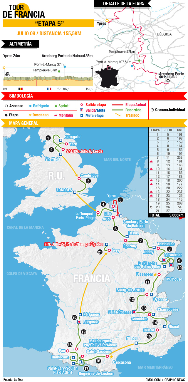 El vigente campeón de Italia Vincenzo Nibali (Astana) conservo el maillot amarillo, la víspera de la jornada que pasará por un peligroso tramo de empedrado, después de una etapa sin grandes cambios en la clasificación general que estaba prometida para los velocistas, y ahí ya no hay dudas de que Kittel es el rey incontestable.