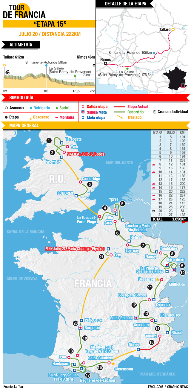 Este domingo se disputará la decimoquinta etapa, con 222 kilómetros en Tallard y Nimes, jornada donde los sprinters vuelven a tener una posibilidad de lucimiento.