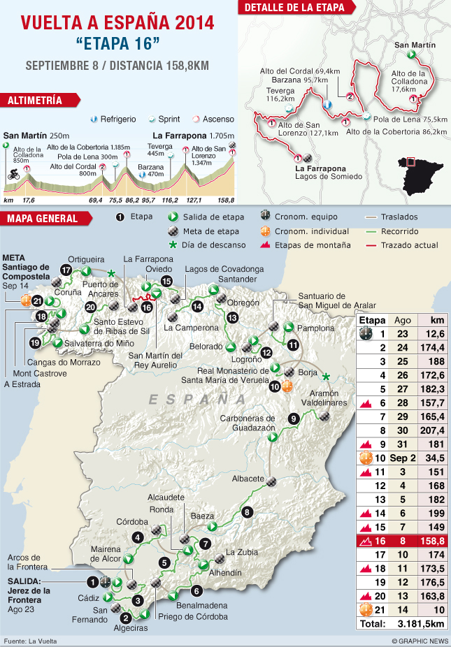 El lunes tendrá lugar la etapa reina de la Vuelta sobre 160,5 km entre San Martín del Rey Aurelio y los Lagos de Somiedo con llegada en un alto de primera categoría, al que se llegará tras pasar otros cuatro puertos, tres de primera categoría y uno de segunda.
