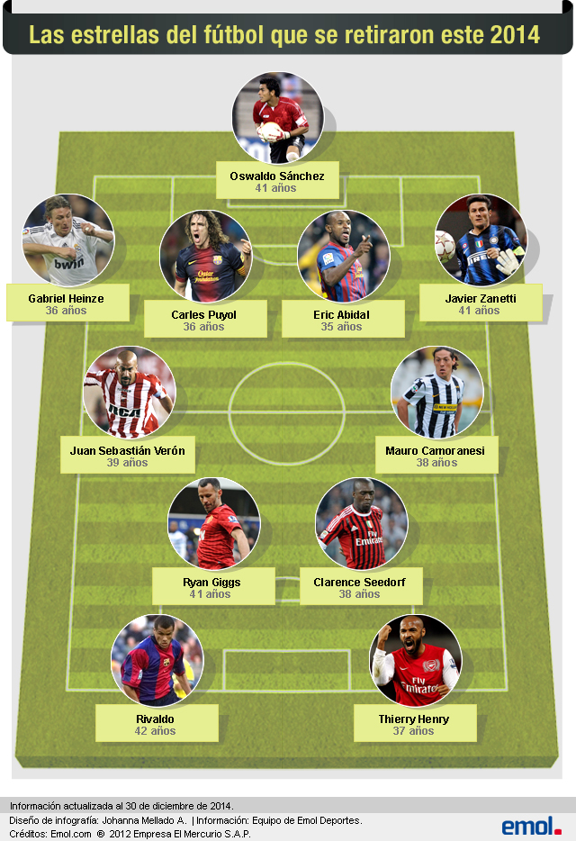 Emol/AgenciasSANTIAGO.- Este 2014 estará marcado por el retiro de varias estrellas mundiales del fútbol. Entre ellas, hay once que destacan y que conforman un equipo de jugadores estelares que decidieron dar un paso al costado. Unos por lesiones, otros por cansancio.
