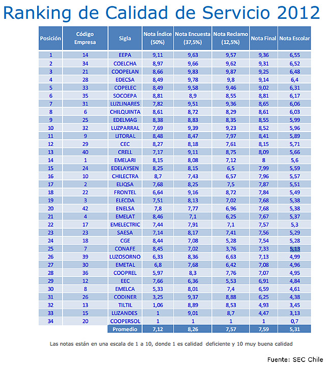 SANTIAGO.- La Superintendencia de Electricidad y Combustibles (SEC) dio a conocer este jueves el Ranking de Calidad de Servicio de las Empresas de Distribución de Electricidad 2012, el cual contiene la evaluación del desempeño de dichas empresas durante el año pasado.