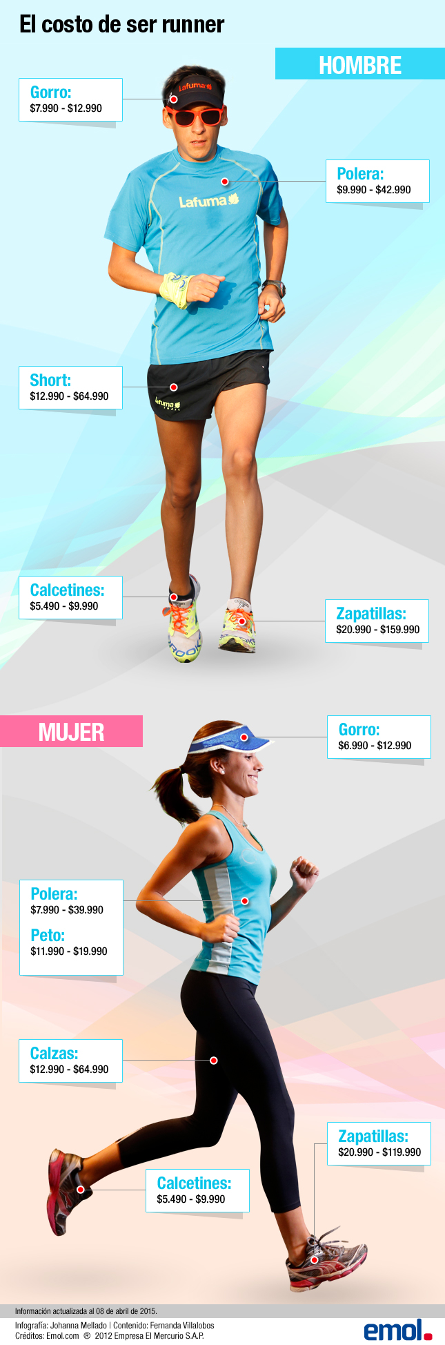 En total, un buen equipo de running, donde se incluyen gorros, poleras, calzas, calcetines y zapatillas de las tres marcas más tradicionales del rubro, Adidas, Puma y Nike, puede llegar a costar entre $60.000 hasta $300.000 para hombres y entre $70.000 y $280.000 para mujeres.
