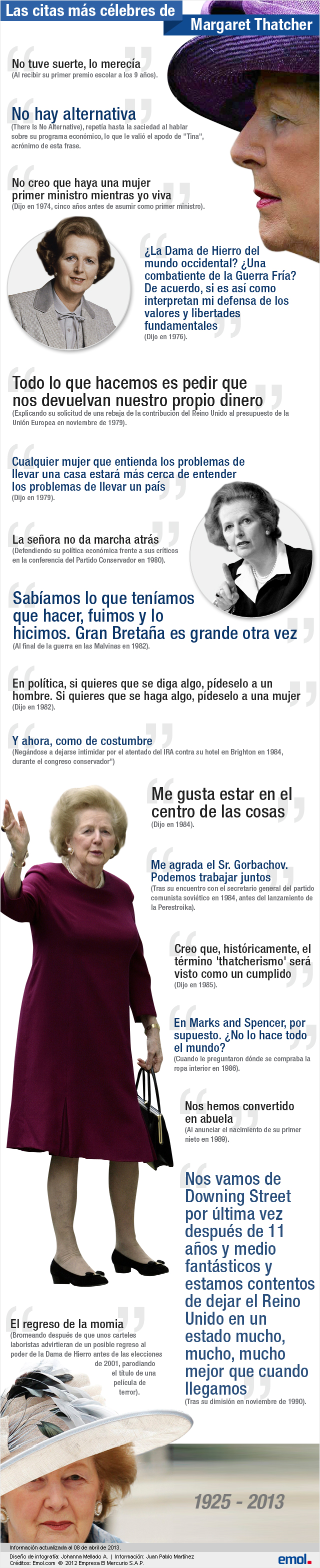 Una de las expresiones más recordadas la realizó al término de la guerra en las Malvinas. "Sabíamos lo que teníamos que hacer, fuimos y lo hicimos. Gran Bretaña es grande otra vez", lanzó.