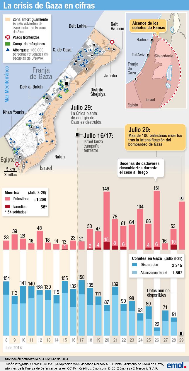 Desde el 8 de julio se han disparado desde Gaza 2.345 cohetes, de los cuales 1.802 han alcanzado Israel. En tanto, lo palestinos fallecidos llegan a más de 1.200 y los israelíes a 56.