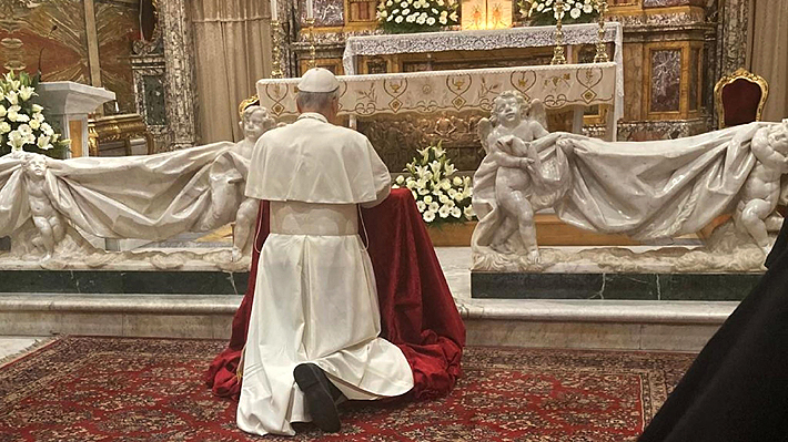 el papa entró en la iglesia, donde saludó a los religiosos y se detuvo a rezar, primero delante del altar y luego de la imagen de la Virgen, donde con los presentes recitó la oración de Juan Pablo II a la Madre del Buen Consejo", se añade en una nota.