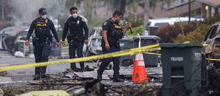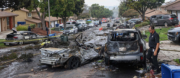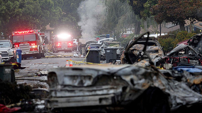 El jefe de bomberos aseguró que "hubo impacto directo sobre múltiples casas" en el vecindario de Murphy Canyon y describió "un campo de escombros gigantesco" en un vecindario denso y compacto con vistas amplias al cañón.