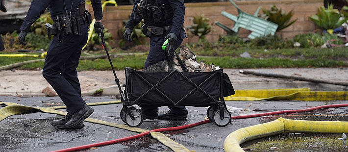 La policía rescató a tres cachorros husky de una de las casas y los alejaron de la escena del accidente en un carrito. A unas pocas cuadras de distancia, familias, incluida la de Moore, estaban en pijamas en un estacionamiento esperando noticias de cuándo podrían regresar a sus hogares.