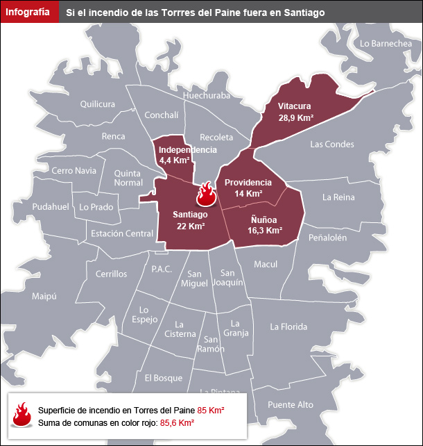 Si el incendio fuera en la capital, la superficie calcinada equivaldría aproximadamente a las comunas de Providencia, Vitacura Santiago, Independencia y Ñuñoa, las que suman un total de 85,6 km².