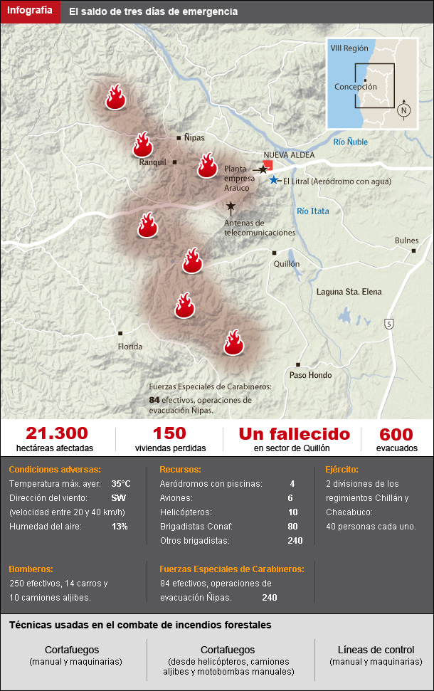 SANTIAGO.- Un fallecido, 600 personas evacuadas y más de 21 mil hectáreas de bosque destruido, son alguna de las consecuencias que ha traído el incendio forestal que afecta a Quillón y otras localidades aledañas en la Región del Biobío.