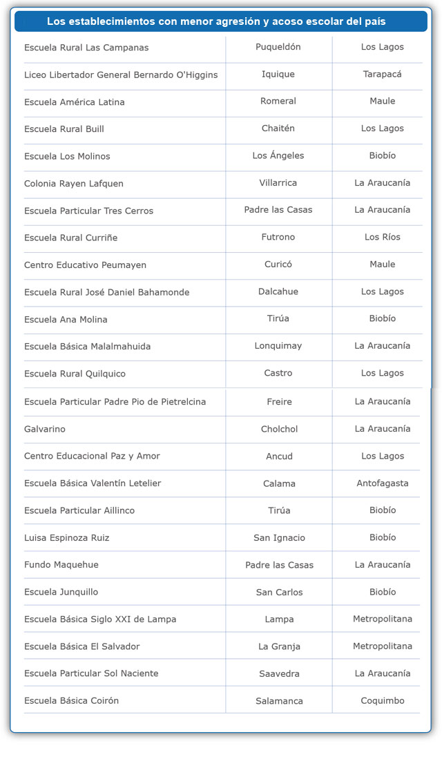 El bullying no discrimina entre tipo de colegio ni nivel socioeconómico, ya que está presente en todos. En los colegios municipales afecta al 10% de los alumnos, en los particulares subvencionados al 9% y en los pagados al 8%. Tampoco se registran grandes diferencias entre estratos socioeconómicos. En el bajo y medio bajo afecta al 11%, en el medio al 9%, y en el medio alto y alto al 8% de alumnos.