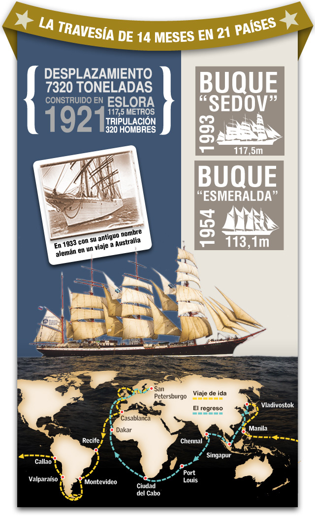 ReutersSANTIAGO.- El pasado 20 de mayo el Sedov zarpó desde el Puerto de San Petesburgo, para iniciar un viaje conmemorativo que se prolongará por 14 meses. El velero construido en 1921 en Alemania inició una travesía alrededor del mundo para conmemorar el 1.150° aniversario del Estado Ruso, recorriendo puertos de 21 países de Europa, América, África y Asia.