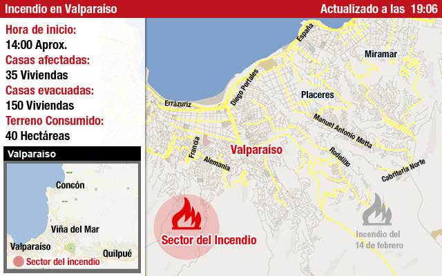 Mapa: Zona del incendio en cerros de Valparaíso
