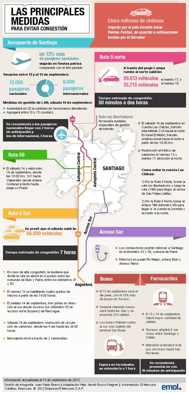 Se espera que cinco millones de chilenos viajen por las carreteras del país durante el feriado nacional. Revisa cuáles son las medidas que se tomarán en Santiago para mejorar la fluidez del tránsito terrestre y aéreo.