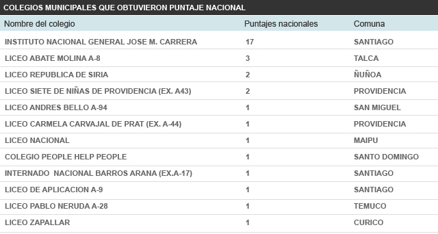 No obstante, el caso del Instituto Nacional es más bien aislado entre los establecimientos municipales, ya que de los 135 colegios que este año registraron puntajes nacionales, sólo 12 son de ese tipo, mientras que la gran mayoría (93) son particulares pagados y 30 particulares subvencionados.