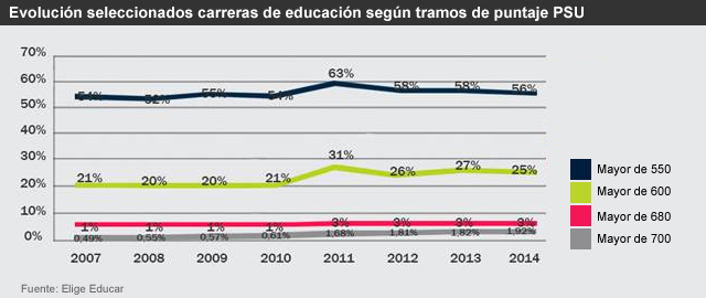 En términos generales, de todos los alumnos que este año fueron seleccionados en Pedagogía, el 57% obtuvo 550 puntos o más en la PSU, es decir, que estuvieron en el tercio de mejor desempeño en la prueba. Si bien en términos brutos su número aumentó (de 4.693 a 5.842), su proporción bajó respecto del año anterior, pasando de representar el 58% al 56% del total de seleccionado en la carrera. Esto se explica porque este año aumentó –de 8.304 a 10.174– el número total de alumnos seleccionados en Pedagogía.