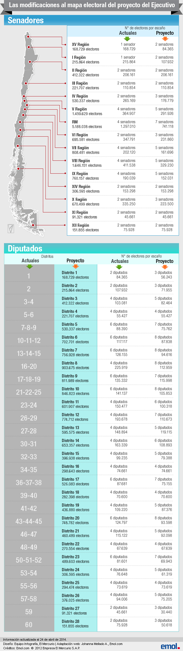 La propuesta de reforma al binominal presentada por el Ejecutivo aumenta el número de senadores de 38 a 50 y diputados de 120 a 155. Además busca cambiar el tamaño de las circunscripciones y distritos.