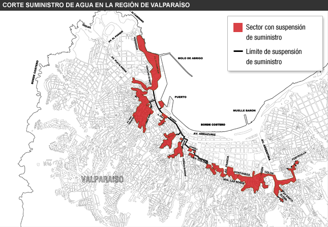 SANTIAGO.- La empresa Esval anunció la suspensión del suministro de agua potable en algunos sectores de Valparaíso, el que se extenderá por cerca de 11 horas.
