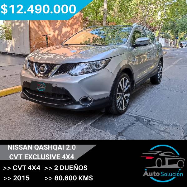 NISSAN QASHQAI 2.0 CVT 4X4 EXCLUSIVE. Precio: $12.490.000 Marca: NISSAN Modelo: QASHQAI 2.0 CVT 4X4 EXCLUSIVE. Motor: 2.0. Transmisión: CVT. Combustible: Bencina. Año: 2015. Color: PLATA. N° de Dueños: 2 DUEÑOS. Kilometraje: 80.600 kms Radio: AUX/CD/BLUETOOTH. Climatización: Climatizador Bizonas. Mantenimiento: Concesionario/Particular. Tracción: Delantera / 4WD Techo: Eléctrico / Panorámico. Asientos: Cuero / Electricos / Calefaccionados. Oportunidad para su próximo dueño, exquisita SUV mantenida de forma particular y en concesionario según pauta de mantenimiento del fabricante, versión tope de línea EXCLUSIVE CVT 4X4, con un lindo techo panorámico para disfrutar de viajes y también de aventuras todo terreno. Espacioso para la familia sin ser un problema para usar el día a día, ya que siendo un SUV no es demasiado grande para movernos con agilidad y comodidad en la ciudad. Gracias a su caja automática CVT nos da un espectacular rendimiento en combustible y una eficiencia única al necesitar acelerar. En inmejorables condiciones. CUIDADO MANIATICO. Disponibilidad para mostrar en la semana y fin de semana, Transferencia rápida a través de autofact pro. Se recibe auto en parte de pago, Gestionamos financiamientos, Pago con Tarjeta de crédito, Gestión de seguro automotriz.